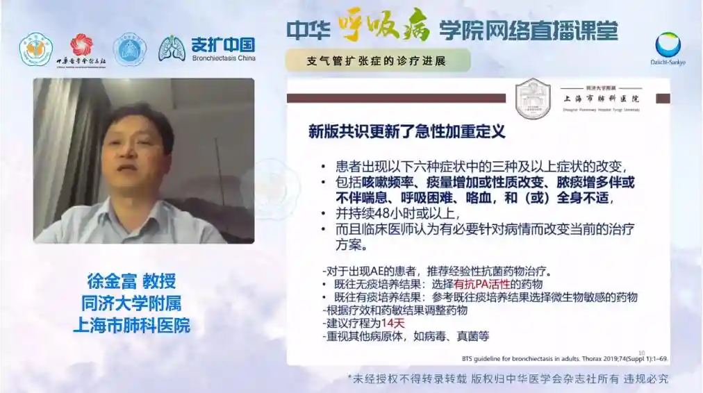 2020年7月27日晚,由中华医学会杂志社、《中华结核和呼吸杂志》编委会主办的“中华呼吸病学院网络直播课堂——支气管扩张症的诊疗进展”通过网络平台进行了在线直播。本次会议邀请到了上海交通大学医学院附属瑞金医院的瞿介明教授主持,讲者分别为广州呼吸健康研究院的关伟杰教授,复旦大学附属中山医院的宋元林教授和同济大学附属上海市肺科医院的徐金富教授。本期的嘉宾都是中国支扩联盟的成员,一直以来都在聚焦和深耕支扩诊疗领域。
