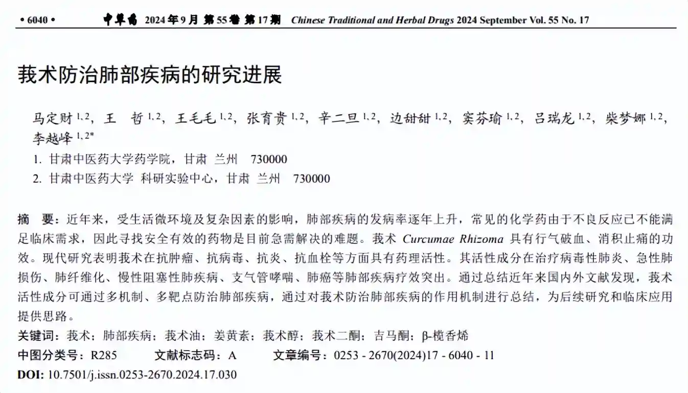 肺为娇脏,主气司呼吸,宣发肃降,主行水,朝百脉。不耐受寒热燥湿等外邪,而且通过鼻与外界相通,又外合于皮毛,最容易受到外界的侵袭。莪术包括莪术油(莪术醇、莪术二酮、β-榄香烯)、姜黄素、双去甲氧基姜黄素等多种成分,在临床上对多种肺部疾病有良好的治疗效果。总结近年来国内外文献报道,发现莪术活性成分对VP、ALI、肺纤维化、COPD、哮喘、肺癌具有较好的保护肺组织作用。但由于肺部疾病易受外邪侵袭影响因素众多,发病因素各有差异,防治的作用机制不相同,而中药多途径、多靶点综合调控的独特性在防治肺部疾病上已经显示出巨大的优势,因此加深对莪术的研究可能会挖掘更多具有防治肺部疾病的活性成分。